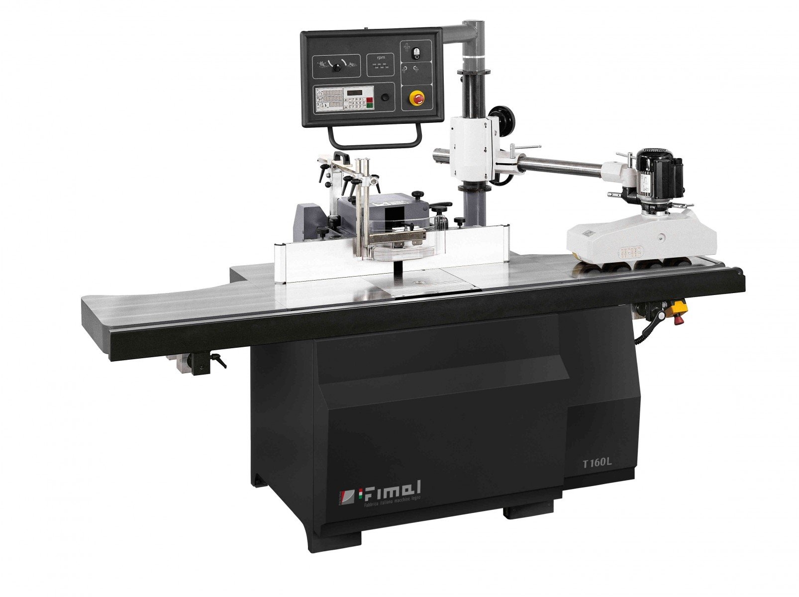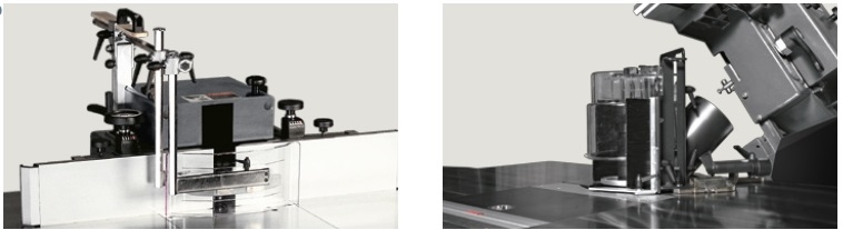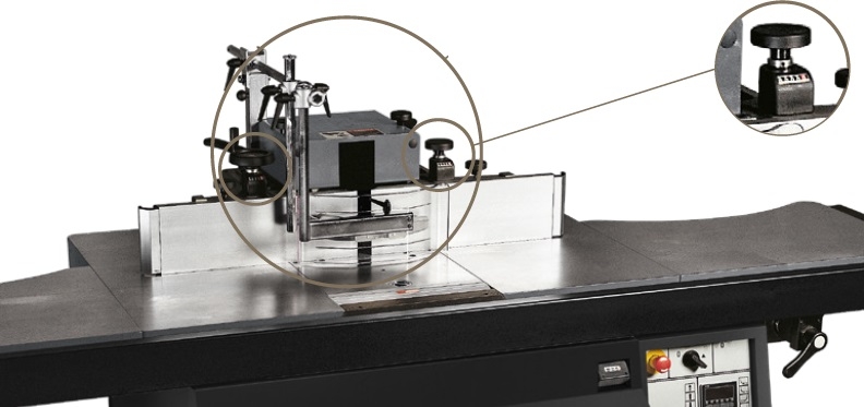 Regulowany mechanicznie ogranicznik nastawny z odczytami, które pozwalają precyzyjnie ustawić zarówno kompletną prowadnicę, jak i stół podający względem narzędzia, z dziesiętną precyzją, która eliminuje konieczność wykonywania próbnych obróbek. Osłona z prowadnicami podawczymi i odbiorczymi z anodowanego aluminium.