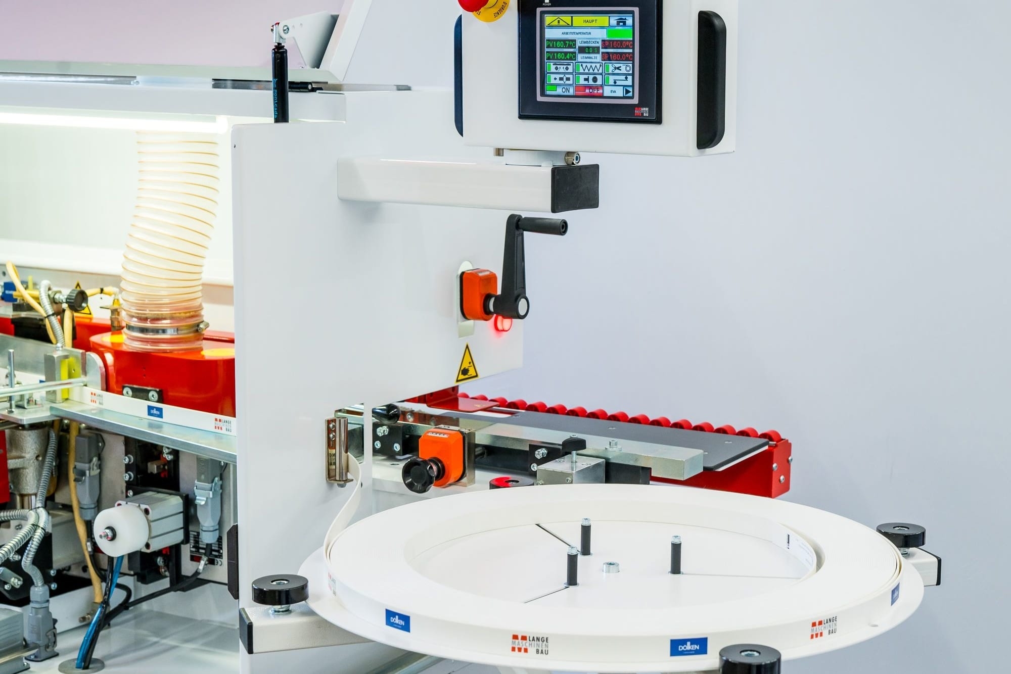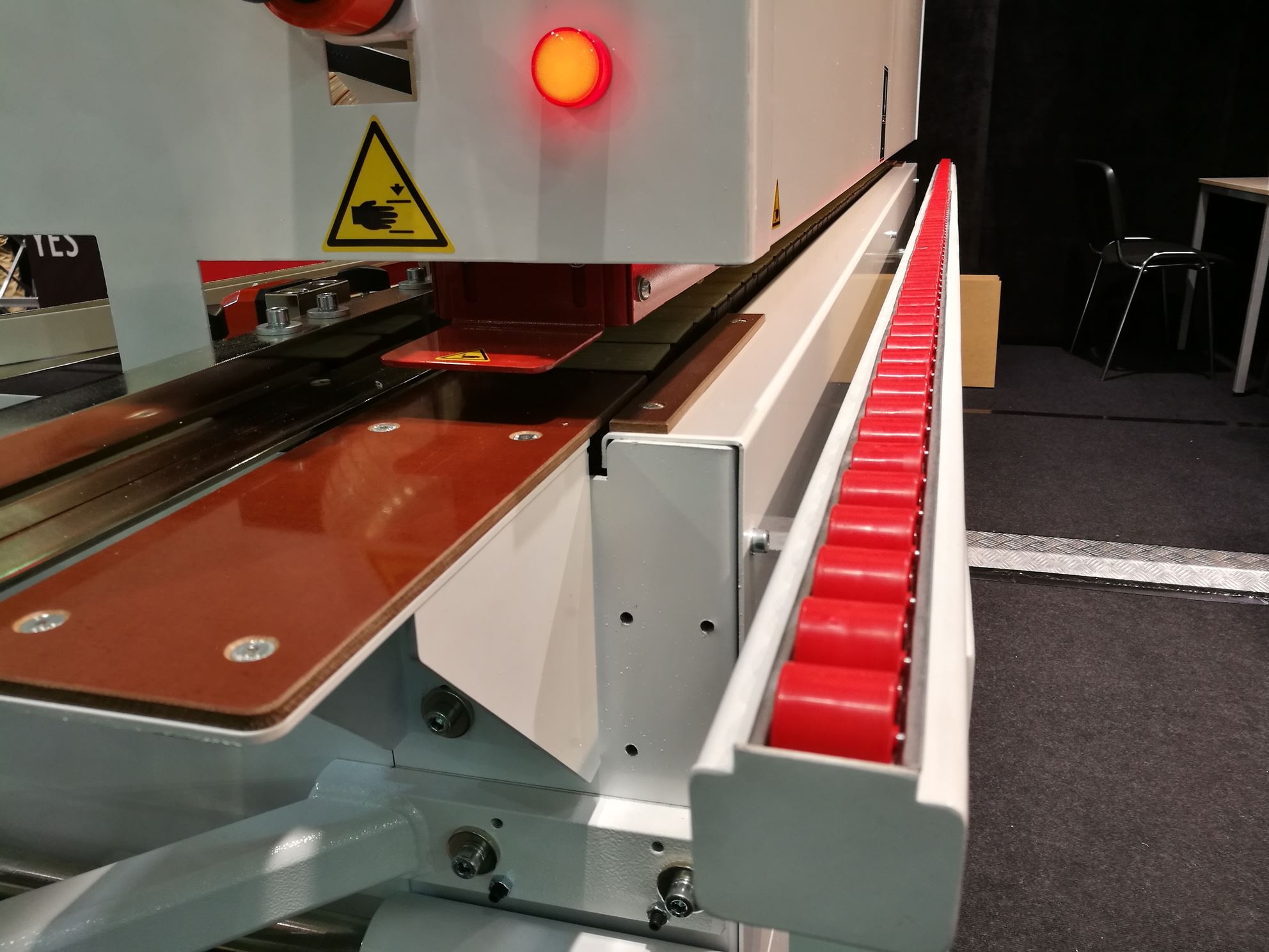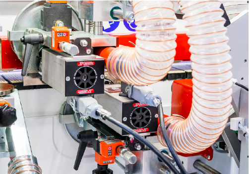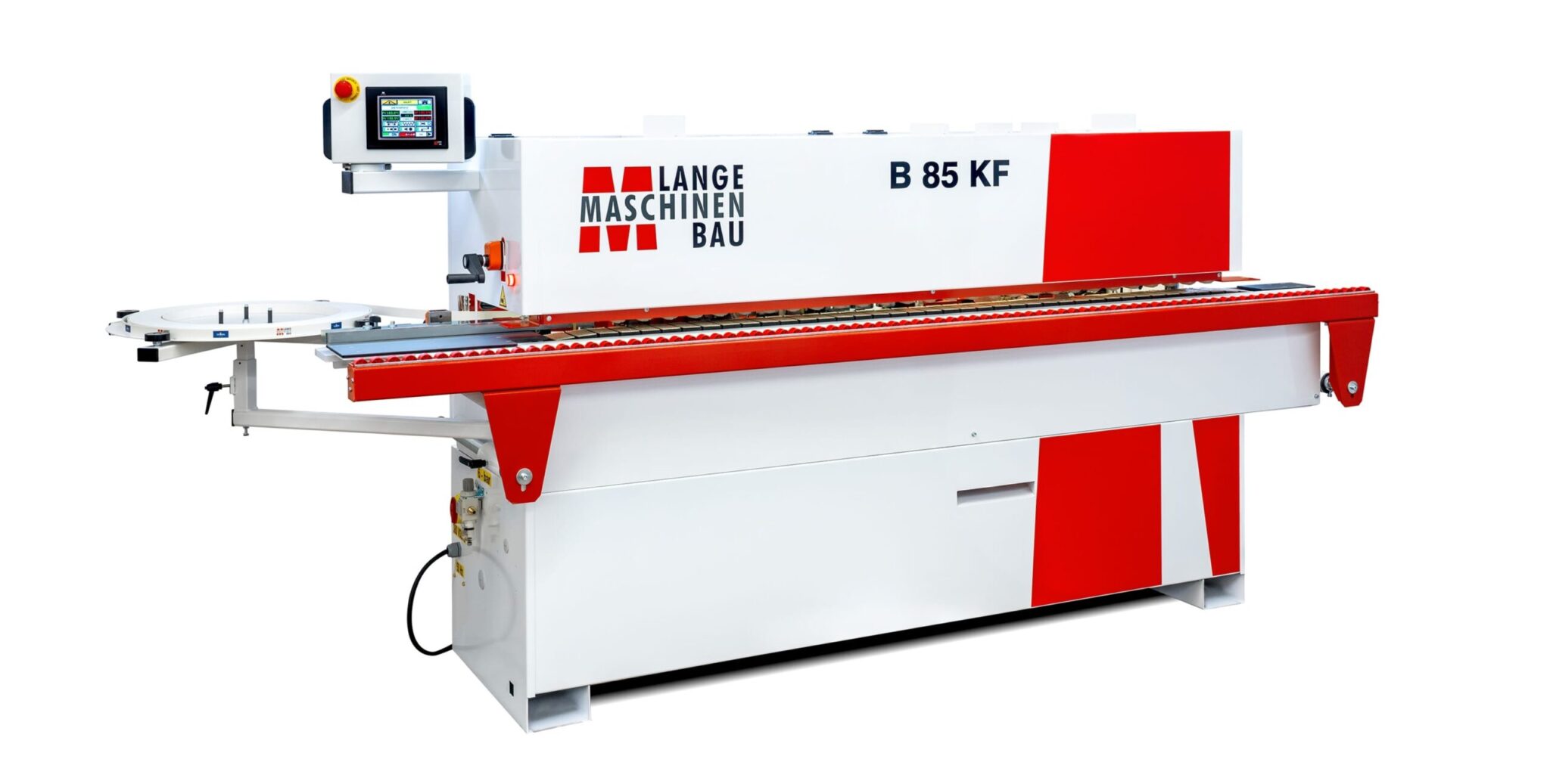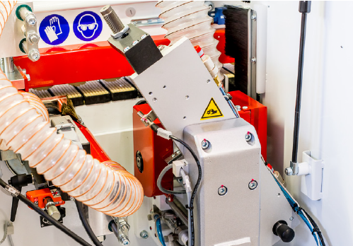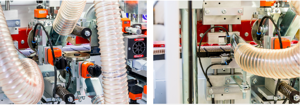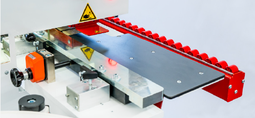 Jednostronna okleiniarka wąskich krawędzi z agregatem wstępnego frezowania płyty, podajnikiem kleju na płytę, kapówką, frezowaniem naddatku obrzeża, łańcuchem transportowym oraz rolkowym dociskiem górnym i wysuwanym podparciem bocznym elementów. Przeznaczona do obrzeży: PCV, ABS, melaminy, obrzeży naturalnych w rolkach lub paskach o grubości 0,4 – 3,0 mm. Grubość płyty 8 – 50 mm.