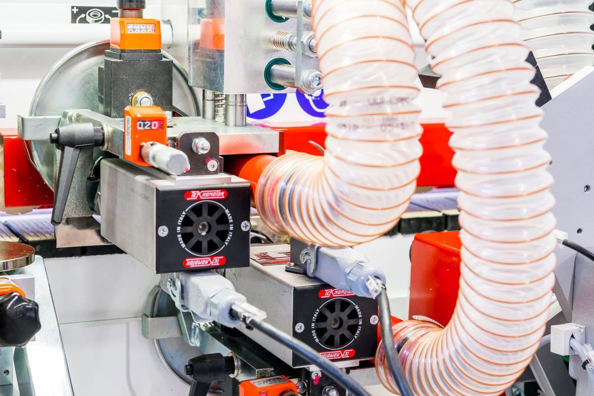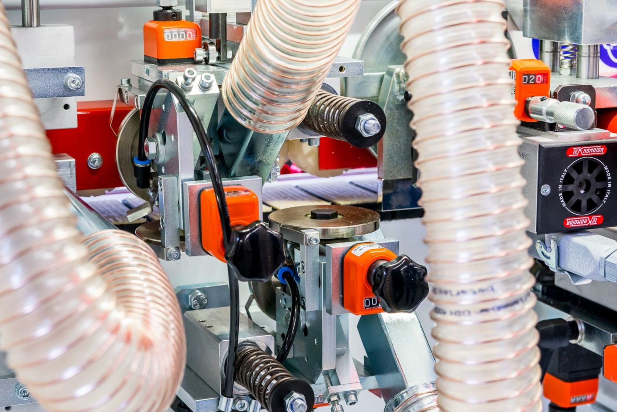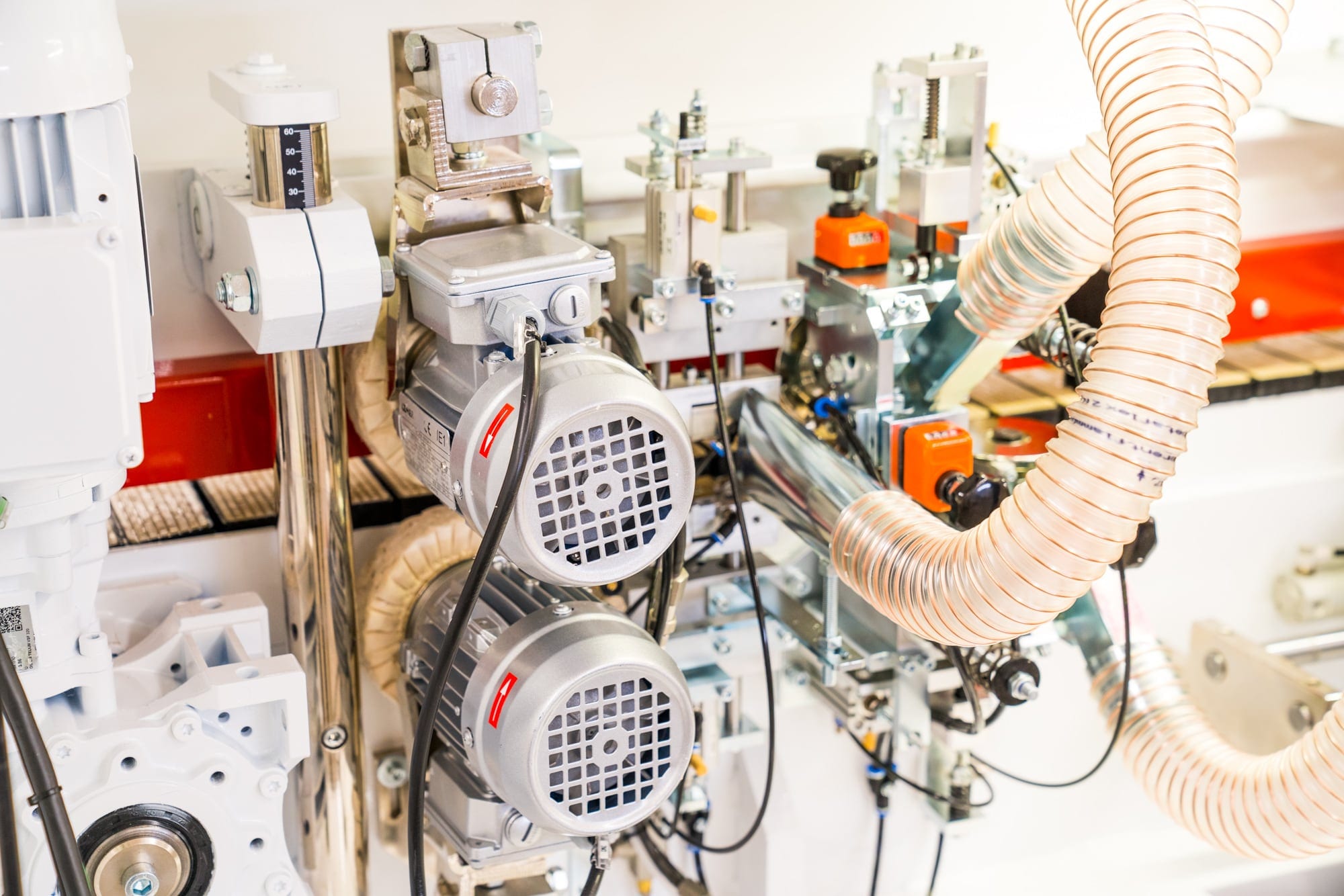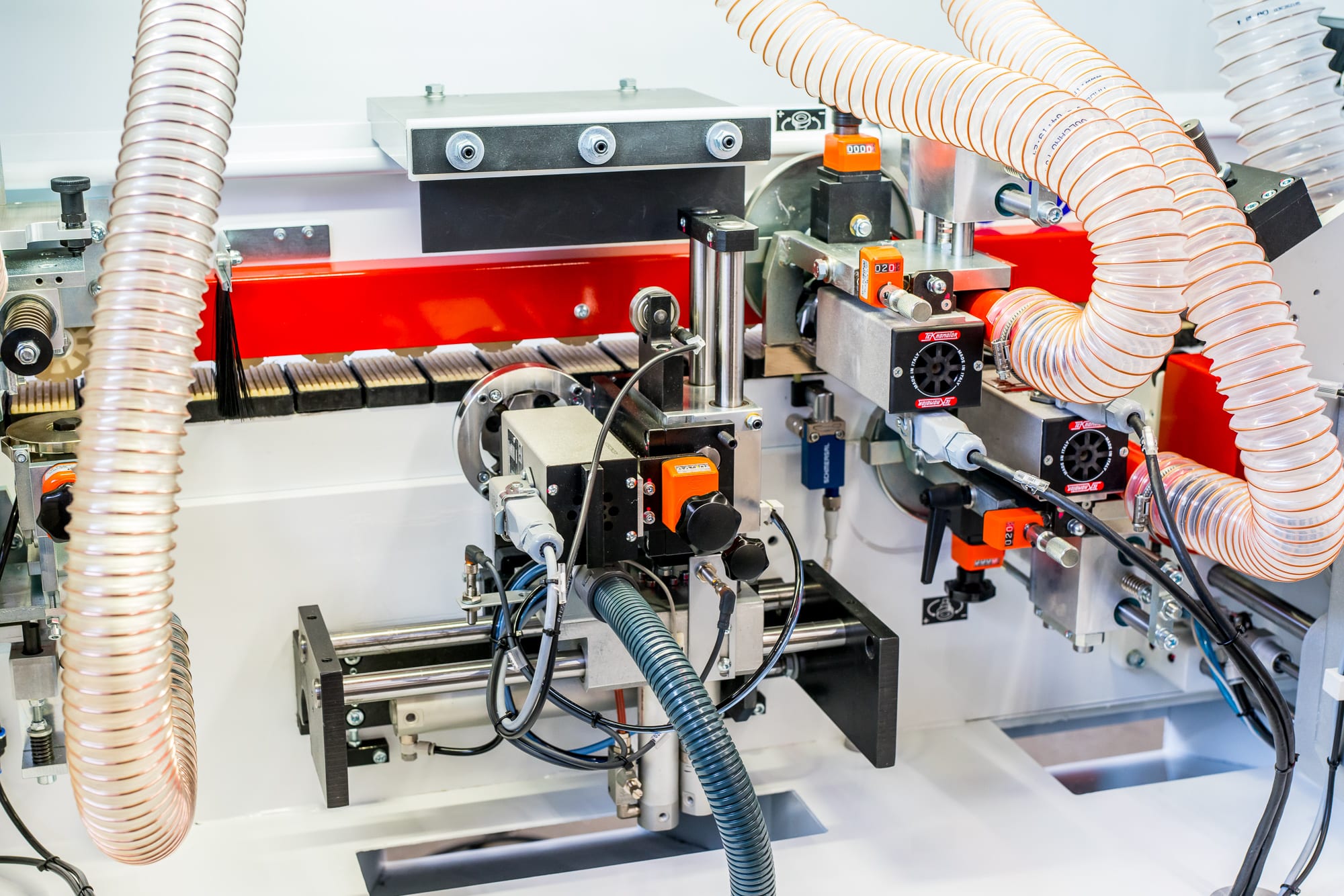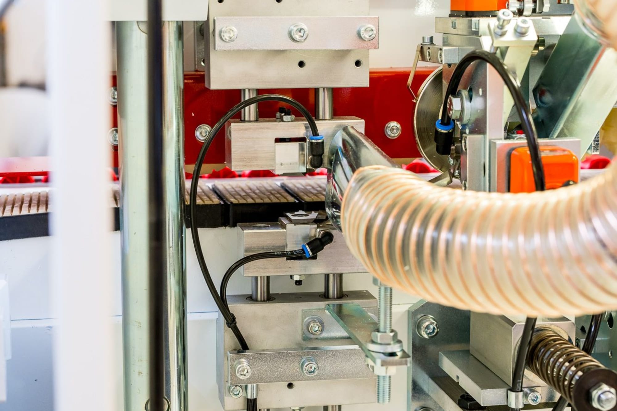 Agregat frezowania wyrównującego płyty – 2 niezależnie sterowane silniki z głowicami frezującymi wyposażonymi w diamentowe ostrza spiralne – zapewnia właściwe przygotowanie krawędzi przed nałożeniem obrzeża |