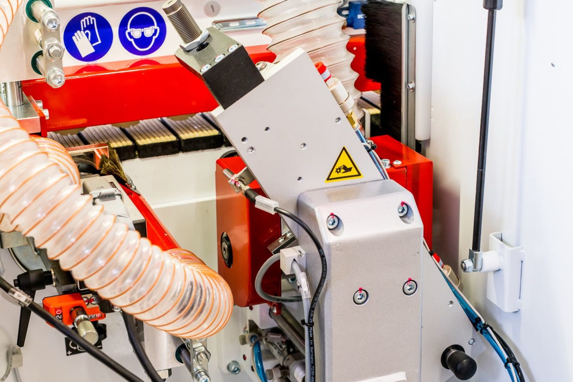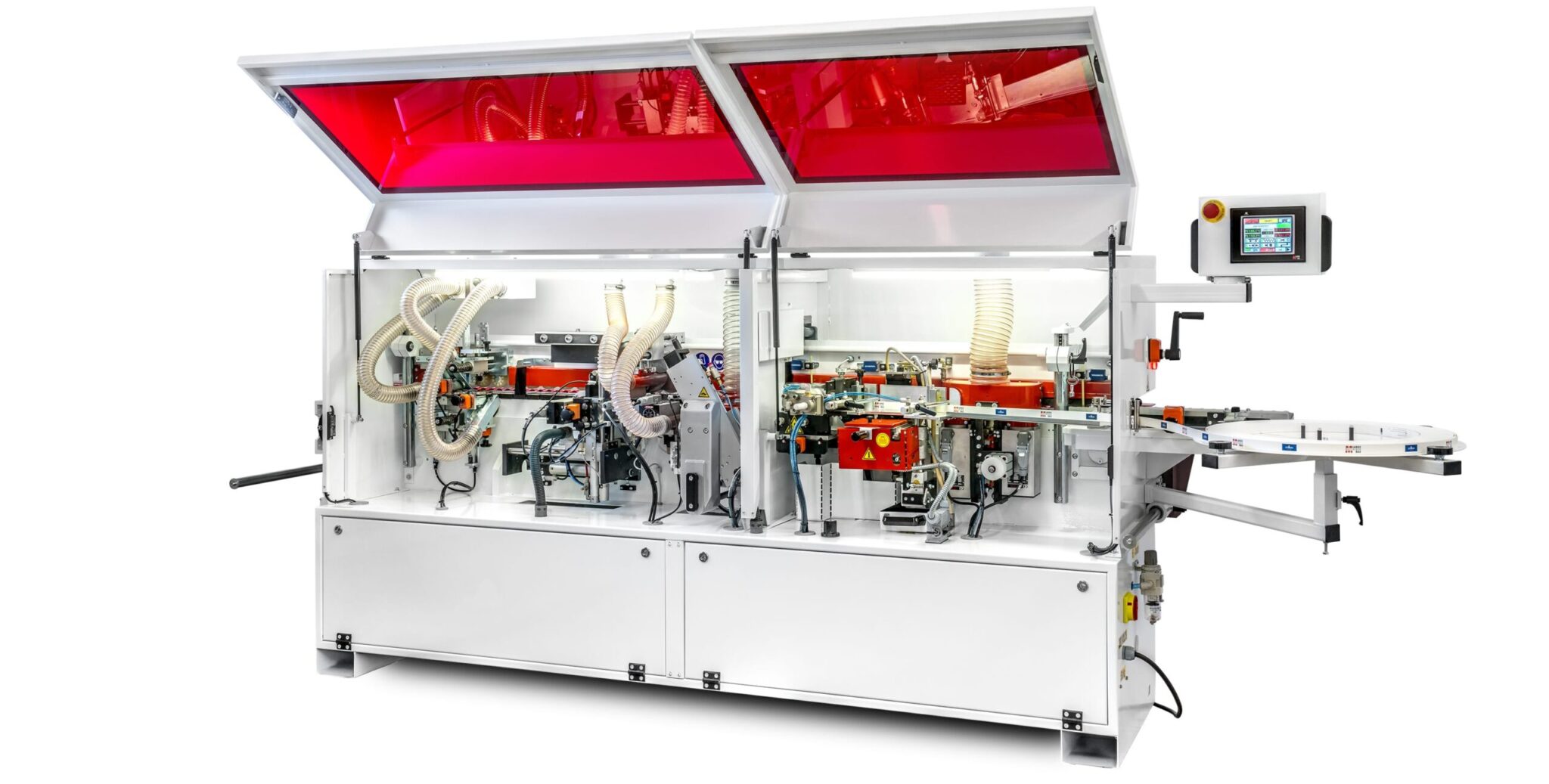 3,5″ Kolorowy wyświetlacz dotykowy maksymalnie upraszcza obsługę maszyny. Umożliwia regulację temperatury kleju, aktywuje agregaty obróbcze, pozwala na regulację wysokości docisku górnego, regulację posuwu i diagnostykę błędów |