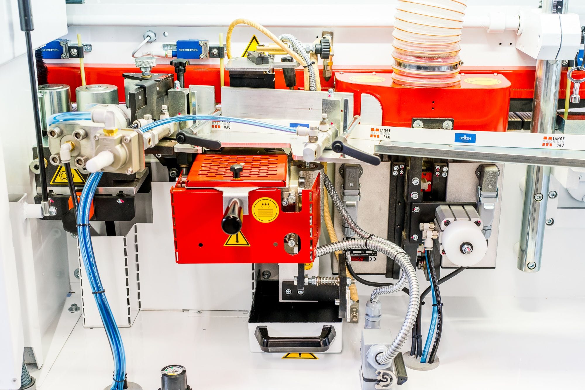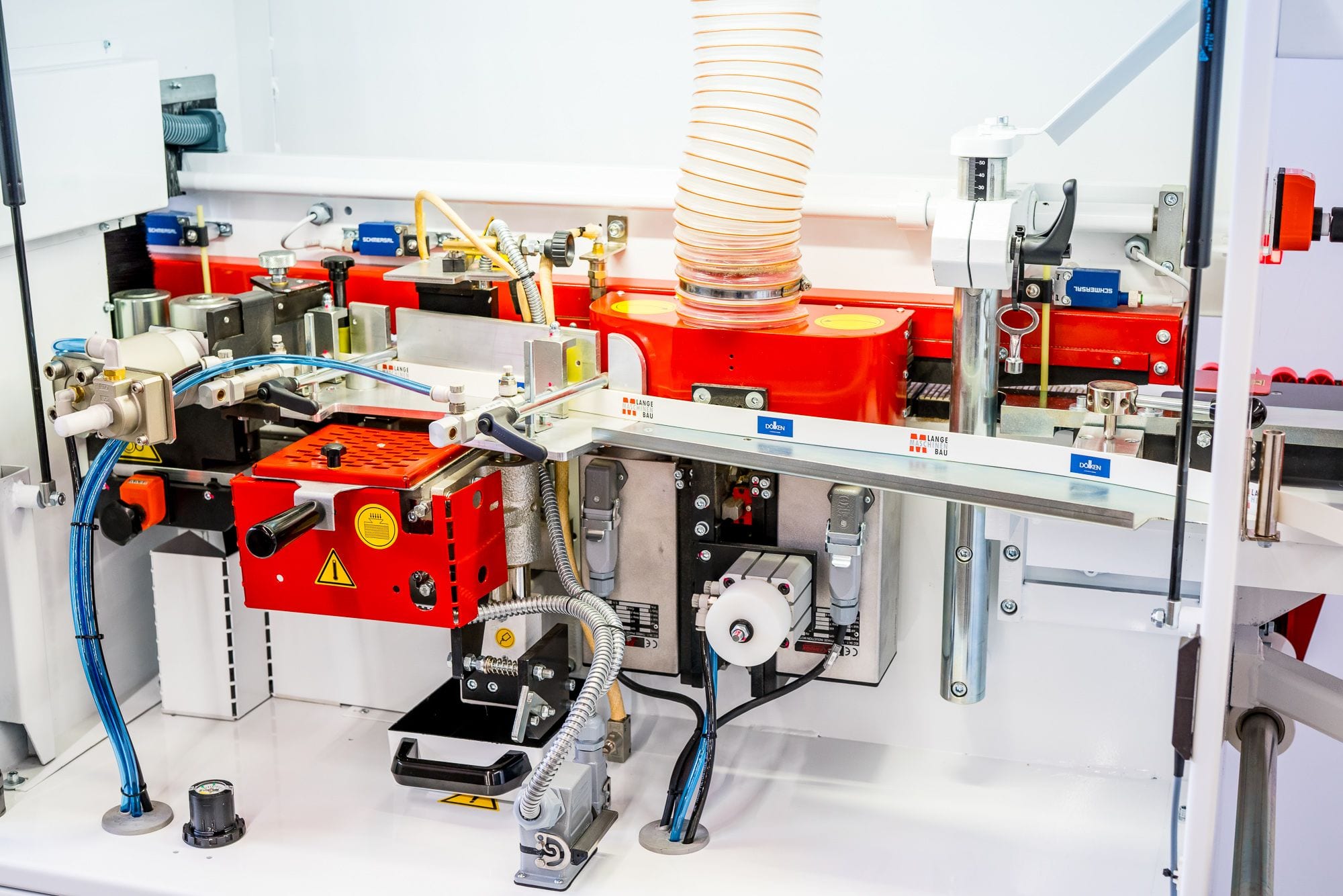 Podajnik kleju bezpośrednio na krawędź płyty: zbiornik powlekany teflonem na 1,5 kg kleju, zabezpieczony przed przypadkowym wylaniem się kleju (nadmiar kleju automatycznie wraca do zbiornika), dokładne dozowanie podawanej warstwy kleju za pomocą rolki klejowej, elektroniczna regulacja temperatury z automatyczną funkcją stand-by (zapobiega przed przegrzaniem kleju, jeśli maszyna dłuższy czas nie jest używana, ale pozostaje włączona) |